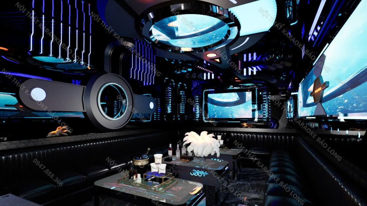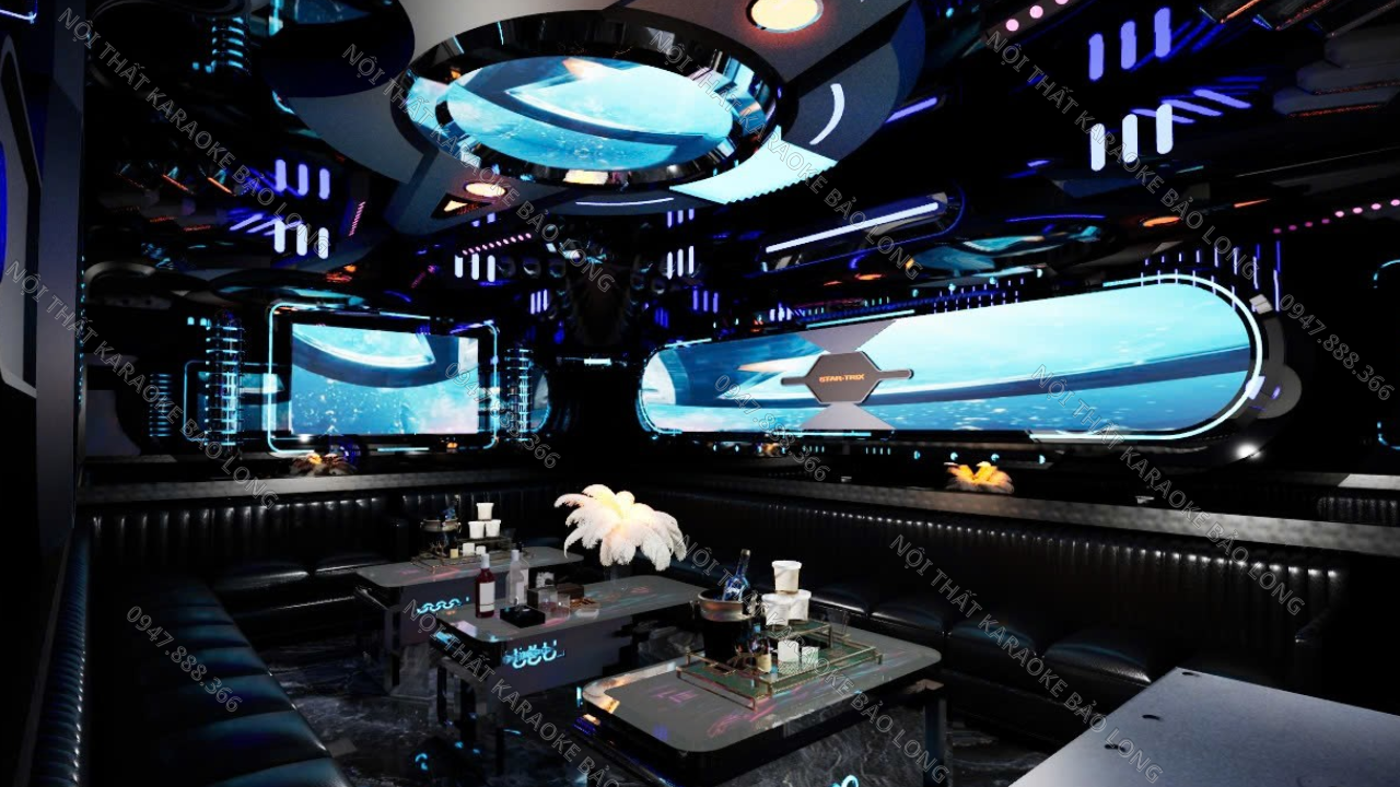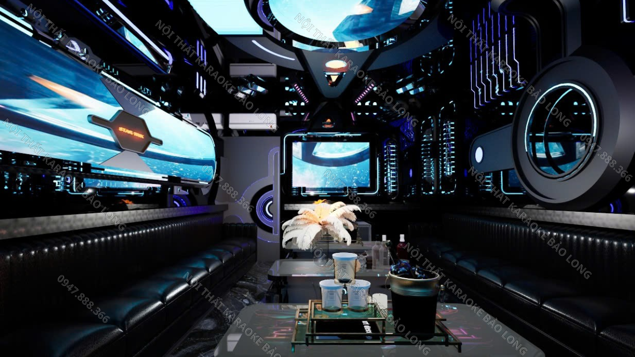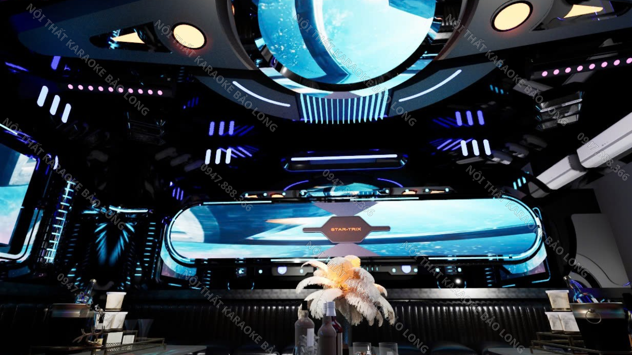 Ngay từ cái nhìn đầu tiên, phòng karaoke P08 gây ấn tượng mạnh mẽ với thiết kế lấy cảm hứng từ không gian vũ trụ. Tông màu chủ đạo là xanh đen huyền bí, kết hợp ánh sáng LED neon và màn hình LED lớn, tạo nên một không gian đa chiều, sang trọng và hiện đại. Khi bước vào, khách hàng sẽ cảm nhận được sự khác biệt với bầu không khí như đang ở trong một con tàu vũ trụ giữa các vì sao.