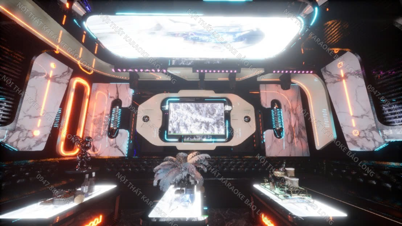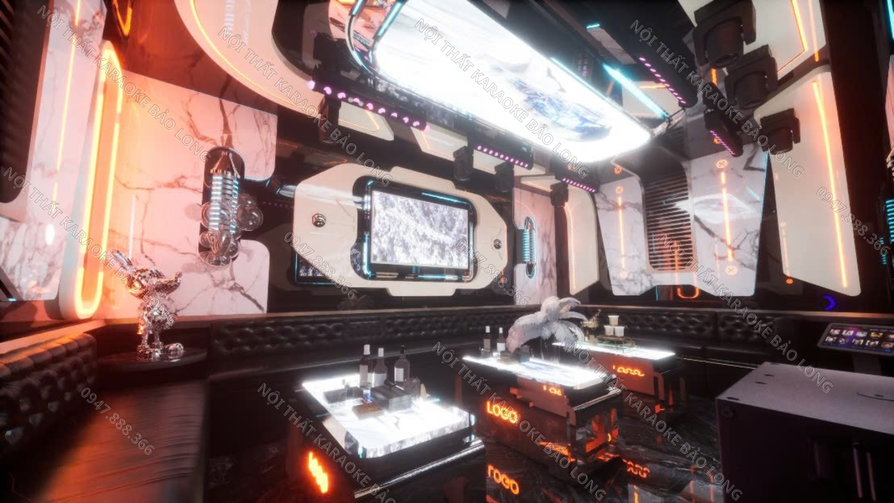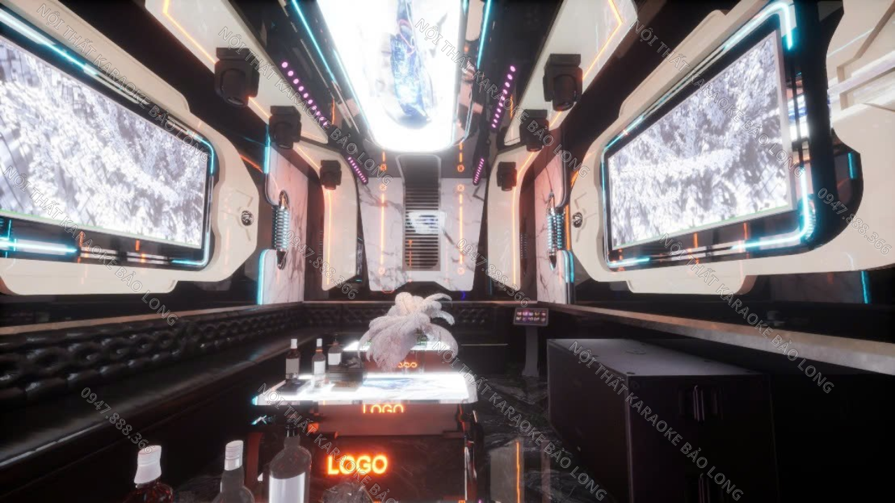 Vách 2 và 3: Hai vách này sử dụng 4 tấm inox gương đen cao cấp, kết hợp với một khối LED vuông mô phỏng hình ảnh cửa sổ phi thuyền. Thiết kế này tạo chiều sâu cho không gian, mang lại cảm giác như đang bước vào một con tàu vũ trụ hiện đại. Hệ thống LED sử dụng tấm P5 với kích thước từ … đến …, cho phép điều chỉnh ánh sáng sống động, giúp không gian phòng karaoke trở nên cuốn hút và phù hợp với nhiều phong cách âm nhạc.